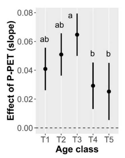 Estimated effect of water balance (P-PET) on black pine basal area increment for each age class. Whiskers represent 95% confidence intervals of the estimated effect. Different letters show statistically significant differences between age classes (p < 0.05).