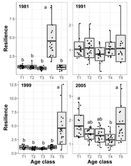 Boxplot of estimated resilience to each studied drought event and black pine age classes. Points depict estimated values. Different letters show statistically significant differences between age classes (p < 0.05).
