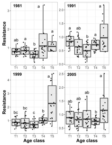 Boxplot of estimated resistance to each studied drought event and black pine age-classes. Points depict estimated values. Different letters show statistically significant differences between age classes (p < 0.05).