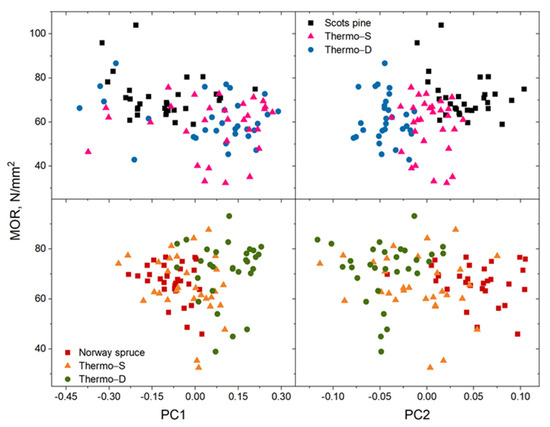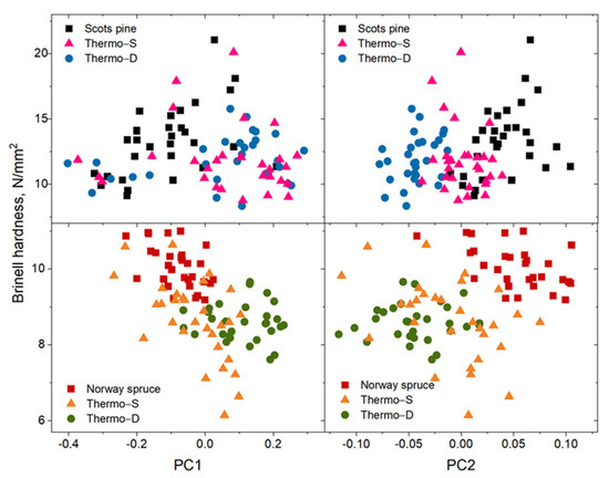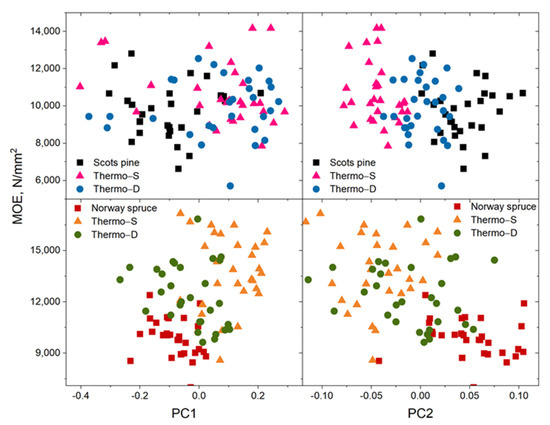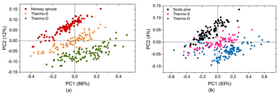 - Popescu, C.-M.; Navi, P.; Placencia Peña, M.I.; Popescu, M.-C. Evaluation of the structural changes occurring in wood during hydro-thermal and thermal treatment using NIR spectroscopy and principal component analysis. Spectrochim. Acta Part. A Mol. Biomol. Spectrosc. 2018, 191, 405–412. [Google Scholar] [CrossRef] [PubMed]