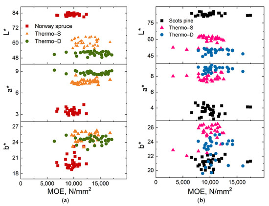 Analysing the parameters before and after the thermal modification, one can observed that the highest changes took place for the L* values, which decreased for both wood species to about 59 for Thermo–S (representing a decrease of about 28%) and 51/50 (representing a decrease of about 34/39%) for Thermo–D Norway spruce and Scots pine. The variation of the L* values due to thermal modification has been highly reported in the scientific literature [33,35,87,88] and was attributed to the formation of new compounds absorbing in visible light [89].