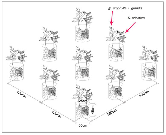 Diagram of E. urophylla × grandis and D. odorifera. Note: In each pot, the plant on the left is E. urophylla × grandis, and the plant on the right is D. odorifera.