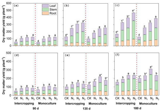 The effects of N application and the planting system on DM accumulation in intercropped and monocropped E. urophylla × grandis (a–c) and D. odorifera (d–f) plants. CK indicates plants without N application, and N1, N2, and N3 correspond to N fertilizer application rates of 3, 6, and 12 g urea (CO(14NH2)2) pot−1, respectively. The different lowercase letters above the bars indicate significant differences (p < 0.05) in whole-plant DM accumulation among the N treatments within each planting system. * indicates a significant difference (p < 0.05) in E. urophylla × grandis or D. odorifera between intercropped and monocropped plants. Error bars indicate ± SE (n = 4).