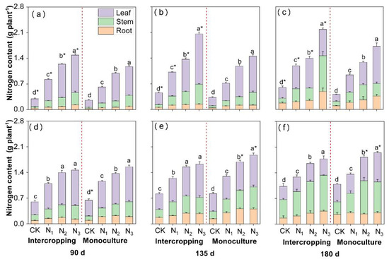 The effects of N application and the planting system on N accumulation in intercropped and monocropped E. urophylla × grandis (a–c) and D. odorifera (d–f). CK indicates plants without N application, and N1, N2, and N3 correspond to N fertilizer application rates of 3, 6, and 12 g urea (CO(14NH2)2) pot−1, respectively. The different lowercase letters above the bars indicate significant differences (p < 0.05) in whole-plant N accumulation among the N treatments within each planting system. * indicates a significant difference (p < 0.05) in E. urophylla × grandis or D. odorifera between intercropped and monocropped plants. Error bars indicate ± SE (n = 4).