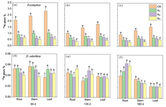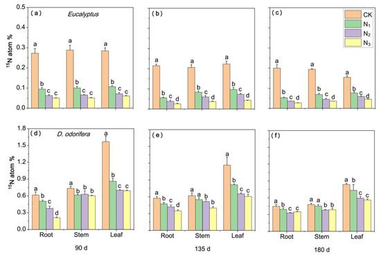 Atom% 15N in excess in plant components of both species in pots where D. odorifera was labeled at different N levels, where atom% 15N is the difference between atom% 15N90, 135 180 days after labeling and atom% 15Nbefore labeled. Panels (a–c) show the atom% 15N of E. urophylla × grandis, and panels (d–f) show the atom% 15N of D. odorifera. CK indicates plants without N application, and N1, N2 and N3 correspond to N fertilizer application rates of 3, 6 and 12 g urea (CO(14NH2)2) pot−1, respectively. The different lowercase letters above the bars indicate significant differences among N treatments (p < 0.05). Error bars indicate ± SE (n = 4).