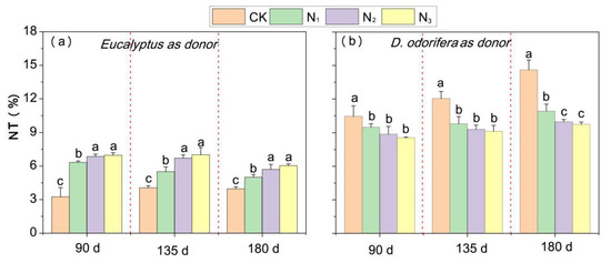 Nitrogen transfer was observed in the Eucalyptus/D. odorifera system at all N application rates. The NT% ranged from 3.2–7.1% when Eucalyptus was the 15N donor and significantly increased with N application. In addition, the NT% under N1 was significantly lower than that under N2 and N3 (Figure 6a). In contrast, the NT% ranged from 8.6–14.6% and significantly decreased with increasing N application when D. odorifera was the 15N donor (Figure 6b). The N level, growth duration and their interactions had significant effects on the NT% regardless of whether D. odorifera or Eucalyptus was used as the donor (Supplementary Table S5).