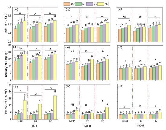 Concentrations of TN (a–c), N-NH4+ (d–f) and N-NO3− (g–i) in the soil at days 90, 135 and 180. The different lowercase letters above the bars indicate significant differences (p < 0.05) in concentrations of TN, NH4+-N and NO3−-N in the soil among the N treatments. MP = E. urophylla × grandis mixed together with D. odorifera plantations; PE = pure E. urophylla × grandis plantations; PD = pure D. odorifera plantations. The different capital letters on the straight lines indicate significant differences in the concentrations of TN, NH4+-N and NO3−-N in the soil among planting systems (p < 0.05). CK indicates plants without N application, and N1, N2 and N3 correspond to N fertilizer application rates of 3, 6 and 12 g urea (CO(14NH2)2) pot−1, respectively. Error bars indicate ± SE (n = 4).