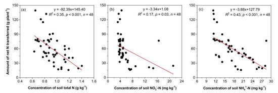 The net amount of N transferred was significantly negatively correlated with the soil N concentration. The net amount of N transferred had a weaker correlation with the concentration of N-NO3− (R2 = 0.17; Figure 8b) and the concentration of TN (R2 = 0.35; Figure 8a) but was more strongly correlated with the concentration of N-NH4+ (R2 = 0.43; Figure 8c).