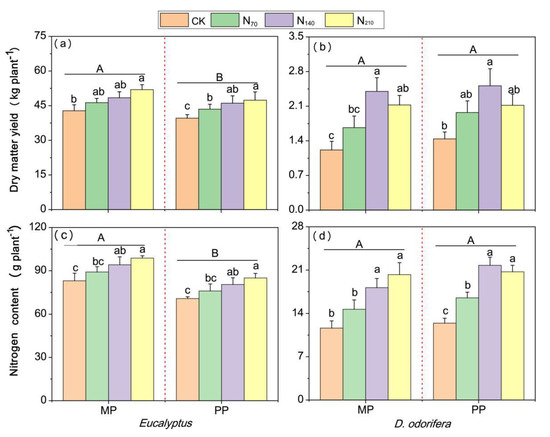 The effects of N application and planting system on the DM yield of and N content in mixed and pure E. urophylla × grandis and D. odorifera plants. CK indicates control plants without N application; N70, N140 and N210 correspond to N fertilizer application rates of 70, 140 and 210 kg urea (CO(14NH2)2) ha−1, respectively. (a,b) represent the DM yield of E. urophylla × grandis and D. odorifera, respectively. (c,d) represent the N content of E. urophylla × grandis and D. odorifera, respectively MP = E. urophylla × grandis mixed together with D. odorifera plantations; PP = pure plantations. The different lowercase letters above the bars indicate significant differences (p < 0.05) in whole-plant DM accumulation among N treatments within each planting system. The different capital letters on the straight lines indicate significant differences in E. urophylla × grandis or D. odorifera between mixed and pure plantations (p < 0.05). There was no significant N level × planting system interaction effect on the DM yield of or N content in either species. Error bars indicate ± SE (n = 3).