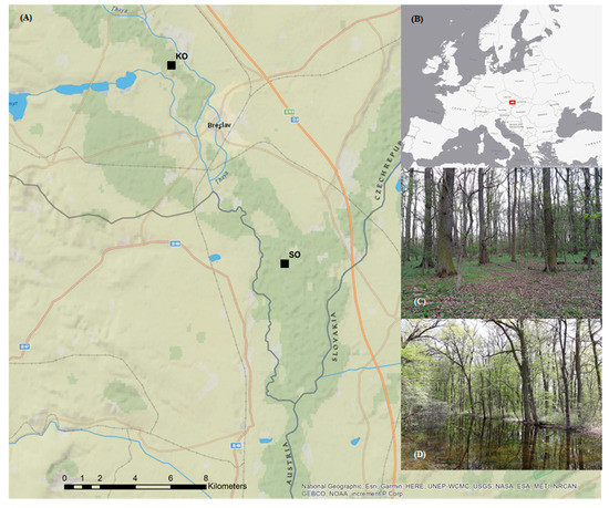 (A) The position of studied sites within the study area, (B) the location of the study area in Europe. The photographs show: (C) SO and (D) KO sites in spring.