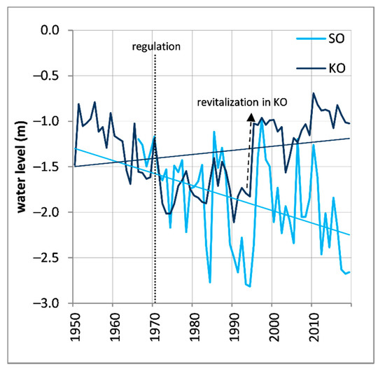 March–September average water level fluctuations at studied sites (SO and KO) with their linear trends represented by straight lines. The dotted line shows the date when river regulation started, while dashed arrows show the start of river revitalization at the KO site, followed by increase of the ground water level (data source: Czech Hydrometeorological Institute, Brno).