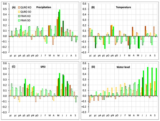 Bootstrapped correlation coefficients between the monthly resolved: (A) precipitation, (B) temperature, (C) three-month standardized precipitation evapotranspiration index—SPEI, and (D) groundwater level and ring width indices (RWI30) of the standard chronologies. Filled bars correspond to statistically significant (p < 0.05) correlation coefficients. Species abbreviations: QURO—Quercus robur and FRAN—Fraxinus angustifolia; site designations: KO and SO.