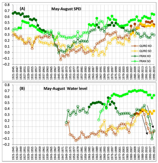Moving correlations calculated between the tree ring width indices and selected monthly climate variables: (A) May–August standardized precipitation evapotranspiration index—SPEI, (B) May–August average water levels. The Pearson coefficients were calculated for 25-year moving windows lagged by 1 year for the 1920–2019 period. Filled symbols correspond to significant (p < 0.05) correlation coefficients. The two arrows show the effect of revitalizations at the KO site. Species abbreviations: QURO—Quercus robur and FRAN—Fraxinus angustifolia; site designations: KO and SO.