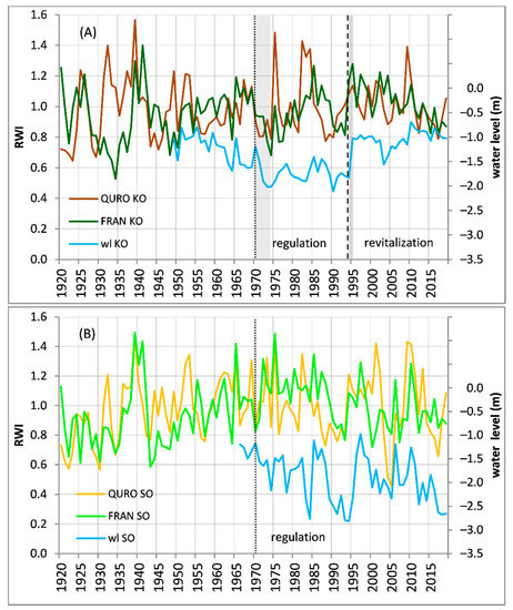 Standard chronologies (RWI100) of Fraxinus angustifolia (FRAN) and Quercus robur (QURO) reflecting medium-to-low variability at sites: (A) KO, (B) SO. The chronologies are plotted against March–September average water levels (wl). The dotted line shows the date when the river regulation started, while the dashed line shows the date when revitalization started. The gray areas show short-term growth reaction to river regulation and revitalization.