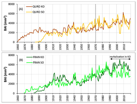 The centennial (1920–2019) growth trends represented by linear trend slopes are not significant for either of the species or either of the sites. After 1972, the growth trend linear slopes were not significant except for FRAN at SO, which shows significant decrease (Table 2, Figure S2). Regarding the trends of BAI chronologies, QURO showed similar trends at both sites, but FRAN showed a considerable difference between KO and SO after 1993, when the BAI increment was better at revitalized KO (Figure 6B).