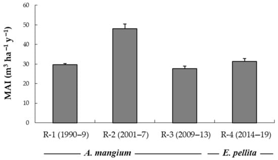 There was a substantial increase in productivity of A. mangium from R-1 to R-2 (Figure 1). This is attributable to improvements in management, including the planting of genetically selected seedlings, conservation of organic matter and nutrients, application of P and weed management. Productivity in R-2 (A. mangium) was markedly higher than in R-4 (E. pellita) under similar slash and litter management regimes, despite R-2 having lower initial stocking (1111 trees ha−1) than R-4 (1666 trees ha−1).