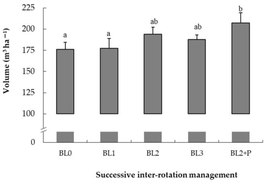 The additional growth response to added P (BL2+P) by E. pellita was strong despite the history of organic matter retention and P applications in the previous rotations. The additional P gave 8% (not significant) more stem volume than BL2, and 19% (p < 0.05) more compared to the treatment where slash and litter were removed (BL0) (Figure 2). At harvest, BL3 and BL2+P had lower stocking with a mean of 1232 trees ha−1 compared with other treatments which were similar at 1300 trees ha−1, but this effect was not statistically significant.