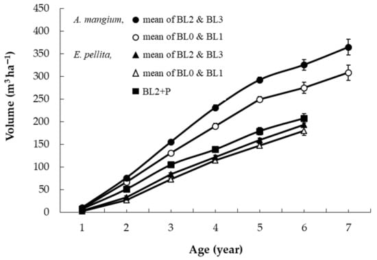 The stem volume growth of R-2 (A. mangium) and R-4 (E. pellita) are compared in Figure 3. For simplifying the presentation, we used the mean of BL0 and BL1 (low organic matter) and the mean of BL2 and BL3 (high organic matter). In both species, the stem volume began to diverge at about age 2 years, indicating that organic matter retention promoted faster growth in A. mangium than in E. pellita. The growth differences between species were maintained throughout the rotation.