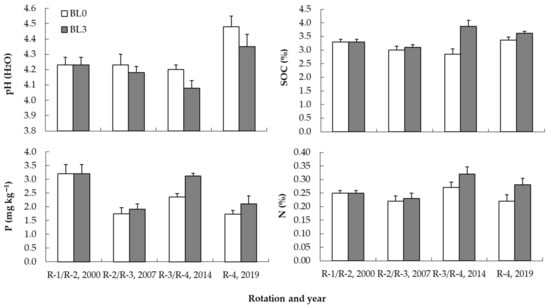 Soil pH at the end of R-4 was higher both in BL0 and BL3 treatments compared with that of R-1; increases were about 0.25 and 0.12 units in BL0 and BL3, respectively. Soil organic carbon (SOC) values were always higher in BL3 (double slash and litter retention) than BL0 across successive four rotations. In both cases, SOC concentrations fluctuated to which sampling and analytical errors may have contributed. At the end of R-4 the SOC was about 10.0% higher than in R-1. Soil N showed a trend similar to SOC, however, at the end of R-4 the N level in BL3 was slightly higher (12.0%) than at the end of R-1, while N level in BL0 showed little change. In BL0 and BL3 extractable soil P declined steadily towards the end of R-2, increased slightly in R-3, and then declined at the end of R-4. Extractable P concentration was higher in BL3 than in BL0 across four successive rotations.
