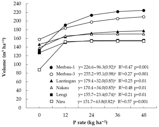 There were positive responses to applied P at all sites from early stages of stand growth. For example, at all sites, at age 2 years, P application resulted in significant positive responses in tree height (p = 0.011–<0.001), stem diameter (p = 0.002–<0.001), stem volume (p = 0.003–<0.001) (data not shown), and this trend continued in volume growth at age 6 years, the common harvesting age in Sumatra.