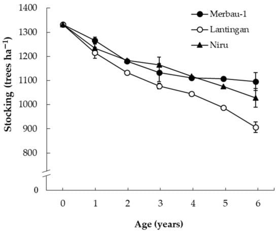 Changes in stocking (trees ha−1) of Eucalyptus pellita from planting to harvest at sites representing three levels of productivity: high (Merbau-1), medium (Lantingan) and low (Niru). Vertical bars are SE of means of four replications. Data was from pooled-data of added P treatment.