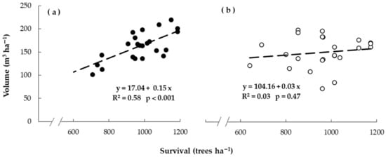 Volume of Eucalyptus pellita at age 6 years: relationship between tree survival and stem volume: (a) with P fertilizer (pooled-data of added P treatments), (b) without P fertilizer. Data points represent individual plots from all replications and respective treatments from six sites.