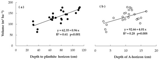 Eucalyptus pellita at age 6 years: relationship between stem volume and (a) depth to plinthite horizon, (b) depth of A-horizon. Data points represent individual plots of P-0 treatment from all replications and six sites.