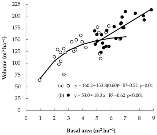 Eucalyptus pellita: relationship between basal area at age 2 years and volume at age 6 years; (a) without P (open circle), (b) with 12 kg P ha−1 (closed circle). Data points represent individual plots from all replications and respective treatments from six sites.