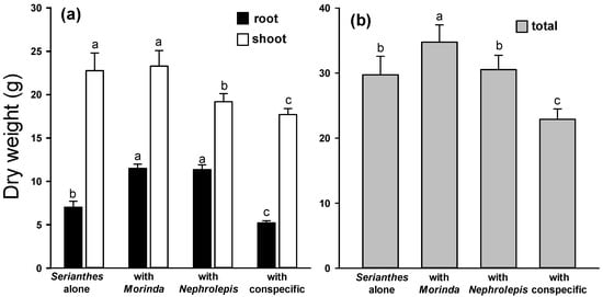 (a) Dry weight of roots (black bars) and shoots (white bars) and (b) Dry weight of total plant of Serianthes grandiflora seedlings grown with different species. Treatments were: Control, no companion; Morinda citrifolia; Nephrolepis hirsutula; Conspecific. Bars represent one SE (n = 8) and bars with the same letters are not significantly different.