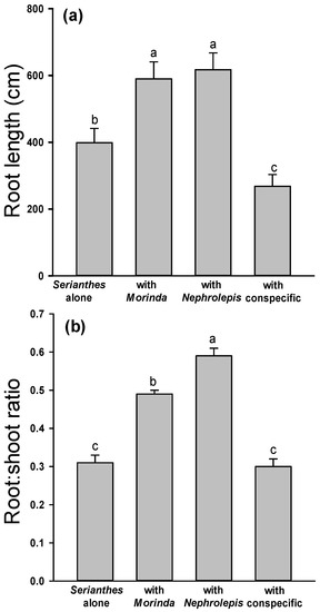 (a) Root length and (b) root:shoot ratios of Serianthes grandiflora seedlings grown with different species. Treatments were: Control, no companion; Morinda citrifolia; Nephrolepis hirsutula; Conspecific. Root:shoot ratios based on dry weight. Bars represent one SE (n = 8) and bars with the same letters are not significantly different.