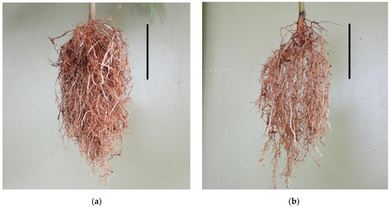 Appearance of Serianthes grandiflora roots after growing 10 months with (a) Nephrolepis hirsutula or (b) Serianthes grandiflora companion plants. Bars = 10 cm.