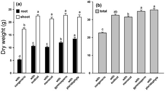 The mean root dry weight of target S. grandiflora plants was affected by companion plant identity (df = 4, 25; F = 46.351; p < 0.001). Root dry weight of target plants increased in the order of companion plant identity: congeneric (S. kanehirae) < eudicot = monocot < gymnosperm < pteridophyte (Figure 4a). The shoot dry weight of target plants was also affected by companion plant identity (df = 4, 25; F = 9.113; p < 0.001). Shoot dry weight of target plants with congeneric companions was less than that of all other treatments (Figure 4a). The pattern of root dry weight among the treatments generated a similar pattern for total plant dry weight (df = 4, 25; F = 30.057; p < 0.001). The gymnosperm and pteridophyte companion plants generated the greatest total plant dry weight of the target plants, and the congeneric companion plants generated the least (Figure 4b).