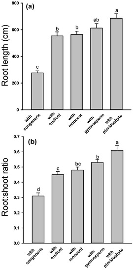 The total root length of target S. grandiflora plants was greater for all heterospecific companion plants than for conspecific companions (df = 4, 25; F = 22.747; p < 0.001). Root length of target plants increased in the order of companion plant identity: congeneric<eudicot = monocot ≤ gymnosperm ≤ pteridophyte (Figure 5a). The root:shoot ratio of target S. grandiflora plants was also greater for all heterospecific companion plants than for conspecific companions (df = 4, 25; F = 19.426; p < 0.001). Root:shoot ratio of target plants increased in the order of companion plant identity: congeneric < eudicot ≤ monocot ≤ gymnosperm < pteridophyte (Figure 5b).