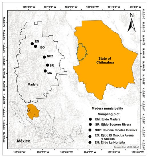 The study area is located in the Sierra Madre Occidental range, in the municipality of Madera, northwest of the state of Chihuahua, Mexico (Figure 1), between coordinates 28°41′18″ to 30°0′14″ N and 107°47′6″ to 108°45′13″ W, at elevations of 2189 to 2580 m (Table 1), in the same general area where a previous study on regeneration was conducted [28]. The study area is covered by natural pine-oak forest sharing the same ecological and biogeographical affinities; the area also shares a similar geological origin and physiography (non-pronounced slopes), with few differences in exposure and elevation, as ravines and high elevations were avoided. The forests in this area include associations of Pinus arizonica Engelm., P. durangensis Martínez, P. engelmannii Carr., P. leiophylla Schltdl. & Cham., P. strobiformis Engelm., Arbutus arizonica Sarg., A. xalapensis Kunth s.l., Juniperus deppeana Steud., Quercus sideroxyla Humb. & Bonpl. and Q. arizonica Sarg. [40,42,43]. The tree densities recorded for the five local rural communities studied (Ejidos: “Madera”, “La Norteña”, “El Oso, La Avena y Anexos”, “Colonia Nicolás Bravo 2”, and “Ejido Socorro Rivera”), correspond to 764, 488, 981, 383 and 1573 trees per hectare, respectively [28], and relatively low heights, of 9.1, 12, 8.1, 15, and 7.2 m, respectively. The mean annual temperature varies between 9.3 and 11.1 °C; average annual precipitation ranges between 650 and 969 mm, and the soil is acidic, of pH 5.4 to 6.1 [44].