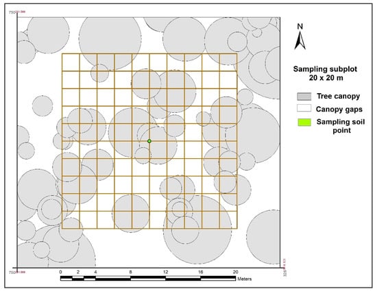 Five 100 × 100 m plots were established in five previously randomly selected forest communities in four “ejidos” and one “colonia”, rural communities where the holders are entitled to share all the benefits [47]. Each plot included four 20 × 20 m subplots, each located in the centre of the quarter of the plot. To determine the variables influencing the occurrence of understorey plant species in the gaps and below the canopy, a grid of 100 units of 2 × 2 m was marked from the centre of each of the 20 subplots (2000 units in total) (Figure 2). In each of these 2 × 2 m units the occurrence of herbaceous and shrub species was recorded, and the location of the species under the canopy or in a gap was also recorded.