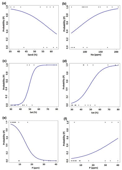 Probability (P) of the presence of species in relation to soil components according to the BLM (p < 0.05): (a) Viola grahamii, (b) Phaseolus parvulus, (c) Acmispon wrightii, (d) Agastache pallida, (e) Ceanothus depressus, (f) Penstemon miniatus. P (phosphorus, ppm), Na (sodium, ppm), Sat (Water saturation, %).