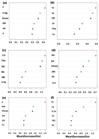The six most important soil variables for the presence of species, detected by Random Forest are listed for presentation purposes. (a) Lupinus diehlii, (b) Commelina dianthifolia, (c) Acmispon wrightii, (d) Arctostaphylos pungens, (e) Agastache pallida (f) Ceanothus coeruleus. NO3: Nitrate (kg/ha), P: Phosphorus (ppm), Ca: Calcium (ppm), Na: Sodium (ppm), K: Potassium (ppm), Fe: Iron (ppm), Mn: Manganese (ppm), Cu: Copper (ppm), OM: Organic matter (%), Sat: Water saturation (%), Silt (%), Clay (%), %Ca: Relative proportion of Ca in CEC (%), %Mg: Relative proportion of Mg in CEC (%), %K: Relative proportion of K in CEC (%), %Na: Relative proportion of Na in CEC (%), CEC: Cation exchange capacity, EC: EC: Electrical conductivity (dS/m). For more information about parameter units see Tables S1 and S2.