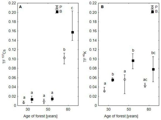 Values of 137Cs (A) and 40K (B) transfer coefficients (TF) in pine (P) and birch (B) stands of different ages (median ± quartile). Different letters denote statistically significant differences in Dunn test after Kruskal–Wallis ANOVA or between tree species inside each age group in Mann–Whitney test (p < 0.05).