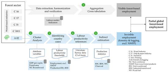 Our methodological approach is based on five consecutive steps (i) to quantify visible employment in the forest sector, and (ii) to estimate invisible employment in the forestry and logging sub-sector (Figure 1). The aggregation of official visible employment figures together with the invisible employment estimates provides an overview of the quantity of people are globally employed in the forest sector. In the following sections, we describe the data sources and estimation processes corresponding to step 1 to 5 of the analytical framework.