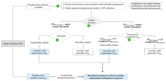 Decision process of identifying countries for invisible employment estimation. Note: LPRW (country) and weighted LPRW (cluster) denote labour productivity of roundwood removals of individual country and weighted labour productivity of roundwood at the cluster level, respectively. Letter a, b, c and d indicate the consecutive step of identifying country cases. * denotes multiplication.