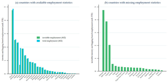 Visible and invisible employment in the forestry and logging sub-sector of selected countries with (a) for countries with available employment statistics, (b) for countries without employment statistics. Notes: Total employment in (a) is the aggregation of visible employment in the forestry and logging sub-sector compiled by FRA 2020 and our invisible employment estimates at the lower-bound. The invisible employment number in (b) is the lower-bound estimates.