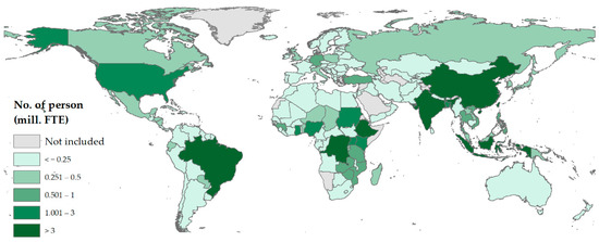 Global view of total forest-based employment. Source: own illustration. Notes: Global employment in this map encompasses visible employment in the forest sector and the lower-bound invisible employment estimates in the forestry and logging sub-sector; NWFP not included.