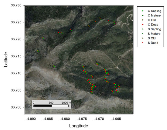 Sampling location of the Abies pinsapo individuals analyzed in this study. Age/survival individual groups are represented by different colours for Saucillo (S, triangles) and Caucon (C, circles) populations. Background satellite image was obtained from Landsat (July 2018).