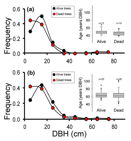 Frequency of size classes (diameter at breast height, DBH) observed in the live (black) and dead (red) trees in Saucillo population (a) and Caucon population (b). The insets show the age at DBH estimated on sampled live and dead trees, based on previous dendrochronological studies. In S population (a), mean ages were 49 ± 7 years in alive trees (n = 12), and 47 ± 6 years in dead trees (n = 10), respectively. In C population (b), mean ages were 65 ± 9 years in alive trees (n = 25), and 64 ± 14 years in dead trees (n = 25), respectively. In the box-plot figure, error bars represent the 5th/95th percentiles; boxes stand for the standard error; solid lines represent the median, and dots are outliers.