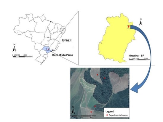 Location of experimental areas in the municipality of Itirapina, São Paulo, Brazil.