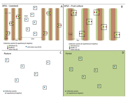 Representative scheme of soil collection performed for different land use systems with emphasis on sampling regions. (A) AFS1—agroforestry system developed for livestock, (B) AFS2—agroforestry system developed for fruit culture, (C) Pasture—pasture system, and (D) Forest—forest fragment in natural regeneration.