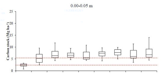C and N stocks were calculated (in Mg ha−1) according to each sampled soil layer by multiplying the concentration of each element (%) by Ds (g cm−3) and layer thickness (cm). As the samples were always collected in fixed layers, the values of carbon stock found were corrected based on their equivalent mass—a methodology proposed in [20]—by using the equivalent soil mass found in the forest area as reference.