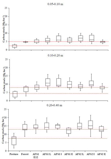 In general, the area cultivated in the pasture had the lowest carbon stock in relation to the remaining land use systems, followed by forest area (Figure 3). In addition, the AFS2 was significant in relation to other land use systems for showing higher mean values for soil carbon stock in the superficial layers; values of 7.73 and 7.09 Mg ha−1 were observed at the layers of 0.00–0.05 and 0.05–0.10 m, respectively. In contrast, for deeper layers, the AFS1 was significant with a carbon stock of 10.66 Mg ha−1 for the layer 0.10–0.20 in AFS1 L and 15.40 for layer 0.20–0.40 m in AFS1 l.
