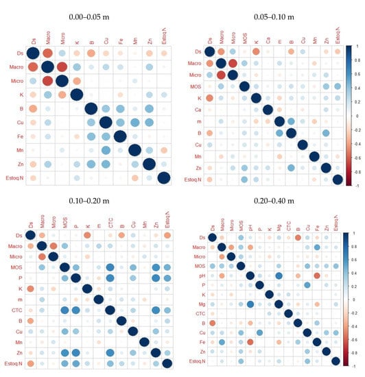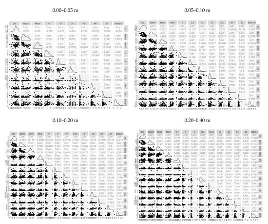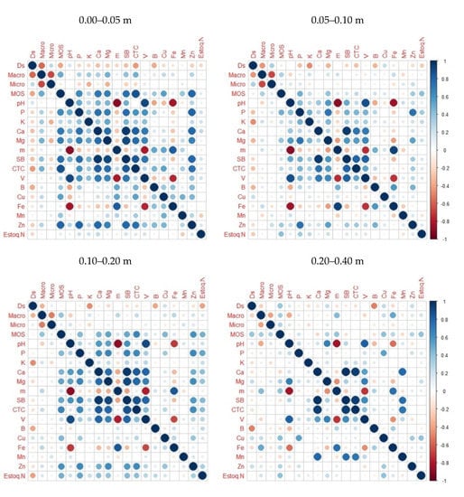 These variables were eliminated because of their high correlation degree; Figure 5 illustrates the variables selected to build the model. Different amounts of variables were selected for each layer and 10 variables were maintained for layer 0.00–0.05 m, 12 for layer 0.05–0.10 m, 13 for 0.10–0.20 m, and 14 for layer 0.20–0.40 m. The layer 0.00–0.05 m presented the highest number of interactions between the variables analyzed, which makes it the only layer to have the lowest number of variables selected to build the model. Furthermore, with the increase in depth, the interactions between the variables became less intense and a larger number of variables was selected for model construction.