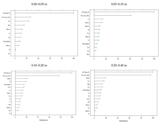 According to Figure 7, nitrogen stock was the most important variable in predicting soil carbon stock, followed by land use system, a behavior verified in all the soil layers available. However, from the third most important variable onward, the variable selected starts to show a differentiation according to the soil layer, revealing Fe and m as the most important variables for the layers 0.00–0.05 and 0.05–0.10 m, respectively, as well as the SOM for layers 0.10–0.20 and 0.20–0.40 m.